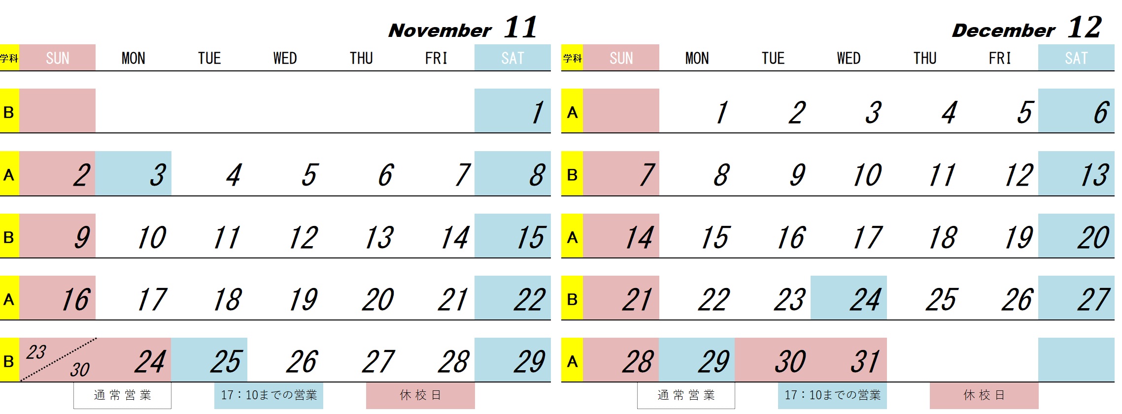 お知らせ 2025.10.31 2025年11月、12月営業カレンダー 2025年11月、12月の営業カレンダーとなります。 また、申し込み受付は通常営業18時30分、 短縮営業は15時までとなっております。 営業時間、休校日等のご確認お願いいたします。