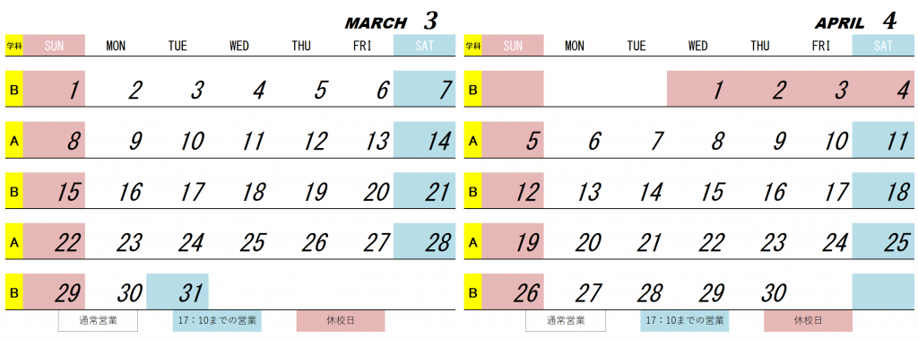 お知らせ 2026.02.28 2026年3月、4月 営業カレンダー 2026年3月、4月の営業カレンダーとなります。 また、申し込み受付は通常営業18時30分、 短縮営業は15時までとなっております。 営業時間、休校日等のご確認お願いいたします。
